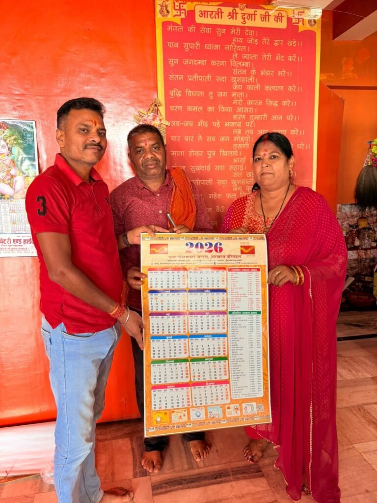माया टुंगरी मंदिर के दामोदर महतो और अर्चना महतो को डाक विभाग का कैलेंडर भेंट करते मार्केटिंग एग्जीक्यूटिव रविशंकर राय।